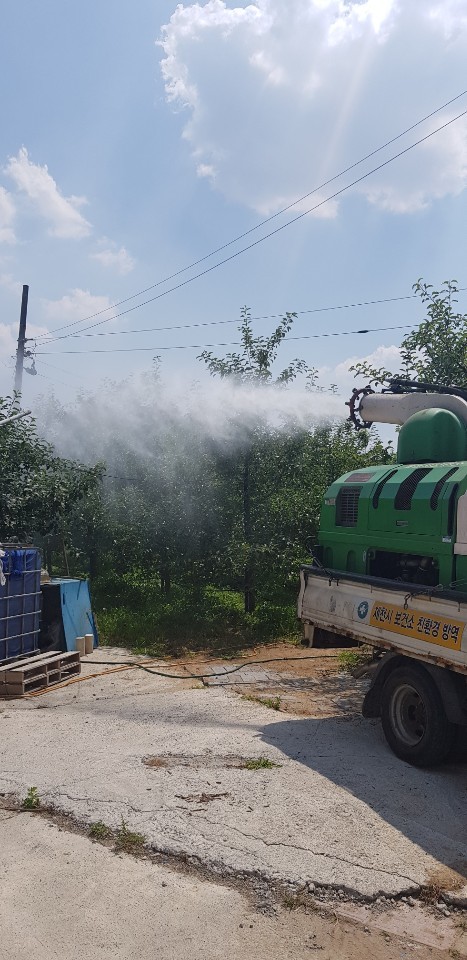 제천시 보건소는 과수화상병 확산을 막기 위해 매몰지 과원 및 의심과원 주변 마을에 집중 방역소독을 실시하고 있다.