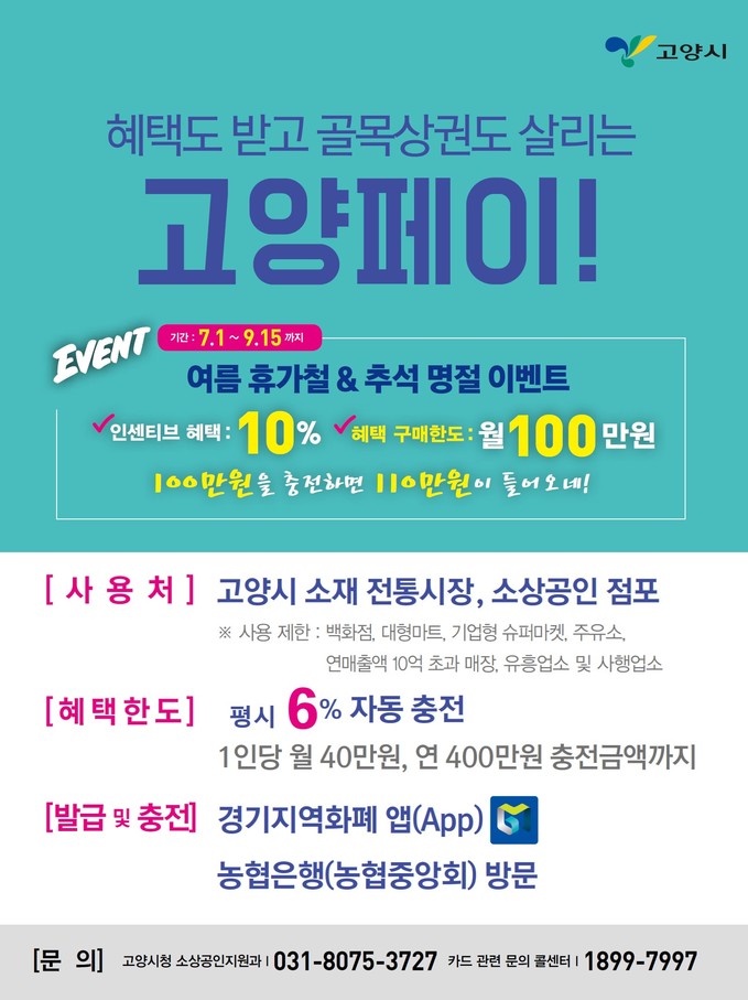 고양시는 여름 휴가철 및 추석 명절 고양페이 특별적립 이벤트를 마련해 7월부터 오는 9월 15일까지 고양페이 구매금액의 10%를 인센티브로 추가 충전해 준다.