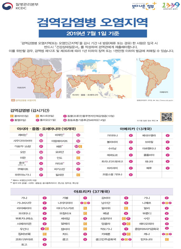 현재 검역감염병은 콜레라, 페스트, 황열, 동물인플루엔자인체감염증, 중동호흡기증후군, 폴리오 6종으로, 질병관리본부는 해외에서 발생하는 감염병 동향을 반영해 2019년 7월 1일부터 검역감염병 오염지역을 기존 67개국에서 66개국으로 변경·시행한다고 밝혔다.