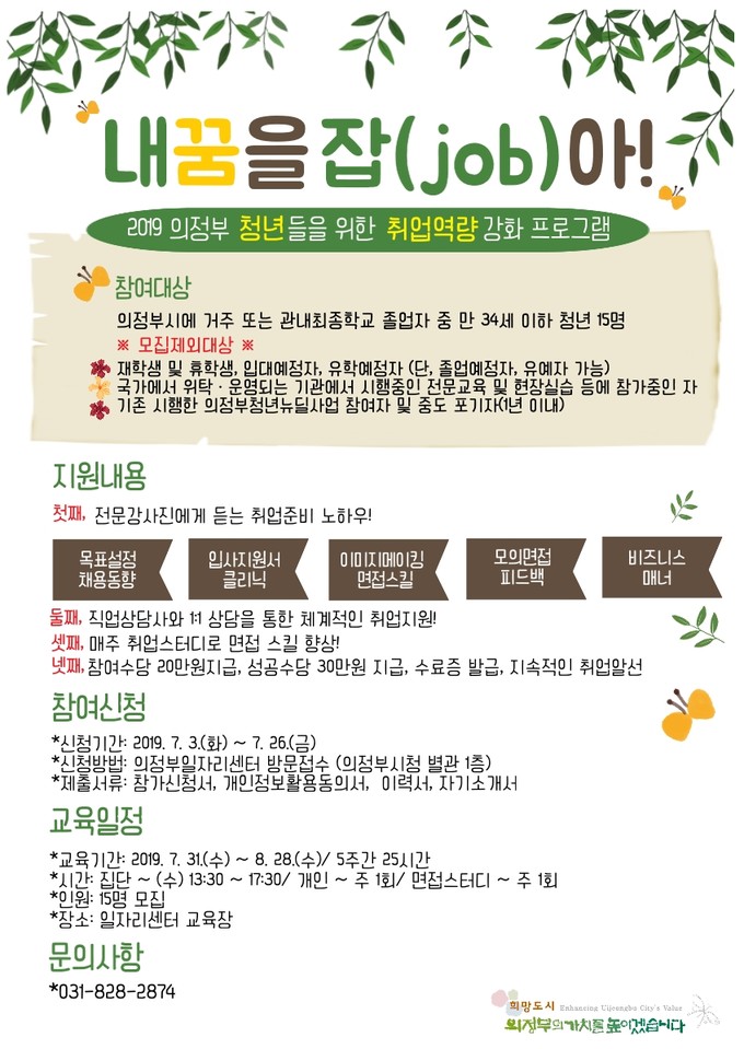 의정부시는 오는 31일부터 8월 28일까지 5주간 청년 실업난 해소를 위한 청년 취업지원 프로그램인 ‘내 꿈을 잡아’를 운영한다.