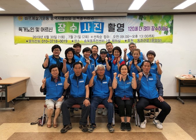 장수사진은 독거 어르신들의 무병장수를 기원하는 바르게살기운동 송북위원회의 주력 봉사활동으로서 현재까지 150여명의 어르신들이 참여했으며, 2019년 송북동 관내를 넘어서 평택시 전역의 독거 어르신들이 참여할 수 있도록 했다.