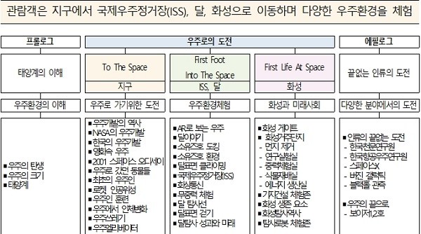 크게 세 가지 섹션으로 구성되어 있는데 To The Space 존에서 인류의 우주 탐험 역사를 한눈에 확인할 수 있고 우주인 훈련 체험도 할 수 있다.