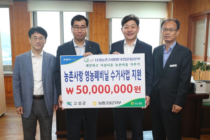 NH농협 고성군지부는 1일, 고성군청을 방문해 농촌사랑 영농폐비닐 수거사업 지원금 5000만원을 전달했다.