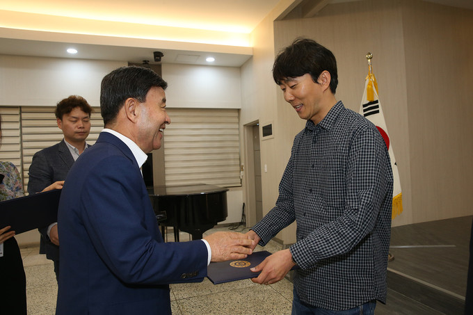 이달의 우수 자원봉사왕(왼쪽 허성곤 시장, 오른쪽 신영복)
