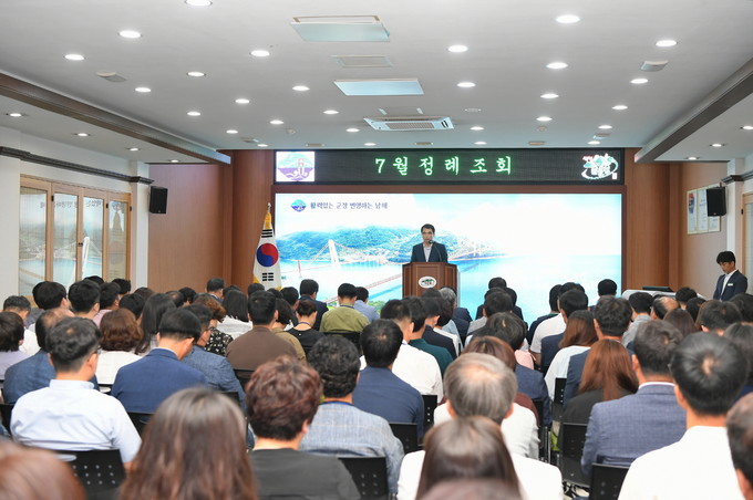 장 군수는 1일 남해군청 회의실에서 직원 120여 명이 참석한 7월 직원 정례조회에서 ‘민선7기 남해군정 1년의 결산과 앞으로의 방향’ 이라는 주제로 민선7기 1주년 남해군민께 드리는 글을 낭독했다.