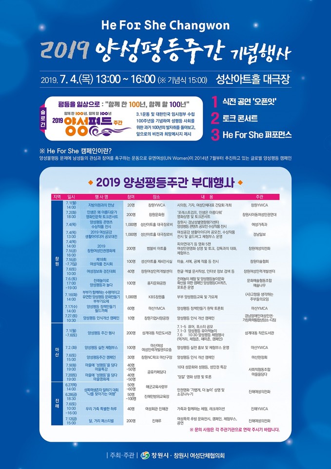 창원시는 2019년 양성평등주간을 맞아 시민들이 참여하고 즐기며 남녀평등에 대한 이해와 관심을 높일 수 있도록 다양한 행사를 마련했다고 밝혔다.