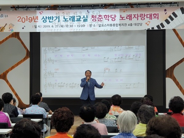 알프스하동종합복지관은 지난달 27일 복지관 대강당에서 2019년 상반기 노래교실 수강생 150여명이 참석한 가운데 ‘청춘학당’ 노래자랑 경연대회를 개최했다고 1일 밝혔다.
