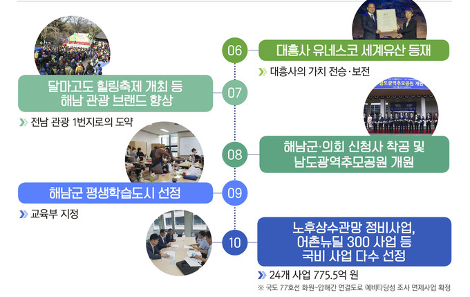 명현관 군수 취임과 함께 지난 1년 해남군은‘빛나라 땅끝, 다시뛰는 해남’의 군정목표로 살기좋은 부자농촌 만들기 등 분야별 군정방침을 마련하고, 새로운 해남을 향한 도약의 계기를 마련하고 있다.
