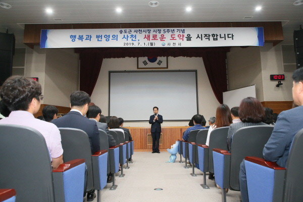 “시민이 먼저입니다”라는 시정지표로 민선 6기에 이어 민선7기에도 순항하고 있는 사천시 송도근 시장이 취임 5주년을 맞아 1일 시청 대강당에서 ‘취임 5주년 기념행사’를 가졌다.