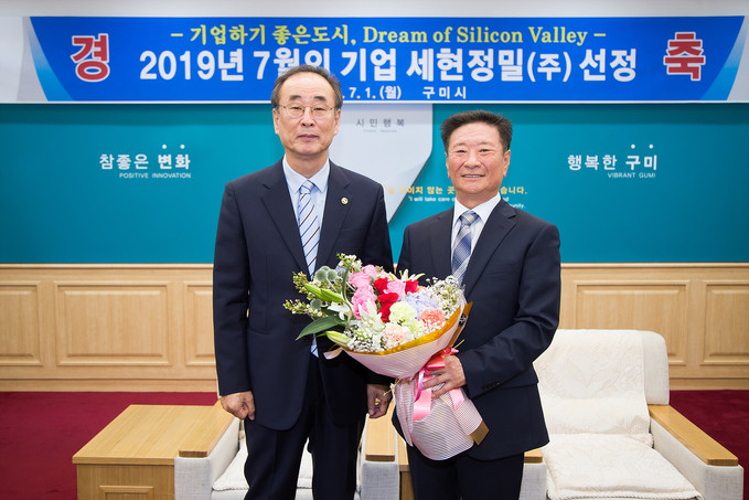 구미시는 지난 22년간 지역경제 활성화에 기여해 온 세현정밀㈜을 2019년 7월 이달의 기업으로 선정해 예우하고, 감사하는 의미를 담아 시청사에 앞으로 한 달간 회사기를 게양한다. 이날 회사기 게양식에서 황욱환 대표는 “그 동안 세현정밀은 창의와 기술력을 바탕으로 고객감동을 실현하기 위해 꾸준히 노력해 왔다. 앞으로도 신뢰받고 지역사회에 기여하는 기업으로 남을 수 있도록 최선을 다하겠다”고 소감을 밝혔다.