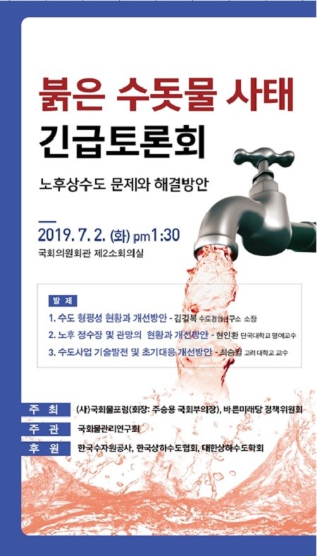 국내 물 관련 주요 학회 및 기관들이 모두 참여하고 있는 사단법인 국회물포럼은 바른미래당 정책위원회와 공동으로 오는 2일 오후 1시 30분부터 국회의원회관 제2소회의실에서 “붉은 수돗물 사태 긴급토론회”를 개최한다.