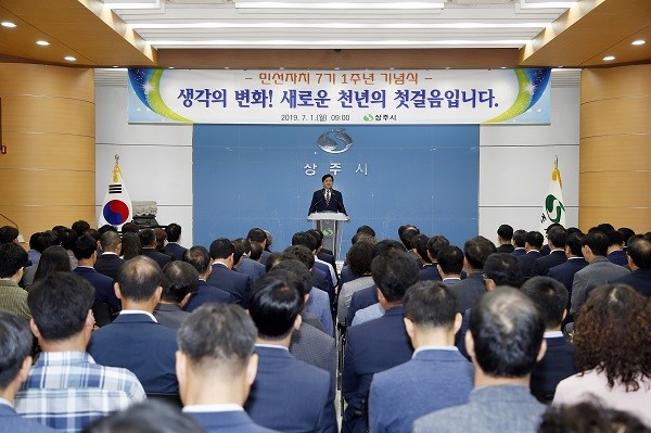 상주시는 1일 시청 대회의실에서 황천모 시장과 직원 등 150여명이 참석한 가운데 시정전반에 대한 성찰을 통해 새롭게 결의를 다지고자‘민선자치 7기 1주년 기념식’을 개최했다.