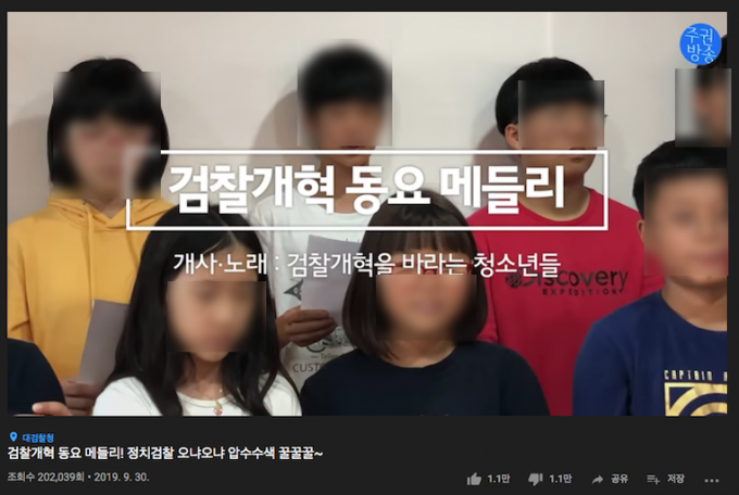 7일 유튜브에 따르면 '주권방송'은 지난달 30 '검찰개혁을 바라는 청소년들'이라고 자신들을 소개한 아이들 11명이 동요를 개사해 부르는 영상을 게시했다. 영상에는 초등학생으로 보이는 아이들이 등장해 "정치검찰 오냐오냐 압수수색 꿀꿀꿀" "석열아 석열아 어디를 가느냐, 국민 눈을 피해서 어디를 가느냐" "적폐들이 한집에 있어, 윤석열·조중동·자한당" 등의 가사를 2 42초가량 부른다.