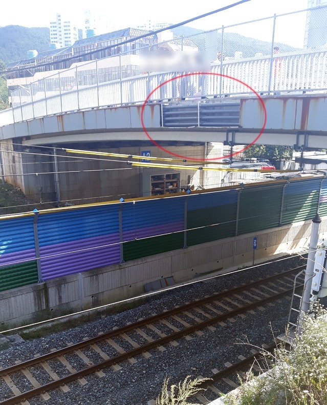 12일 코레일과 부산소방재난본부 등에 따르면 이날 오전 9시26분께 부산 기장군 양화가선교에 설치된 150㎝, 세로50㎝ 크기의 철판이 강풍에 떨어져 동해선 전차선을 덮쳤다.