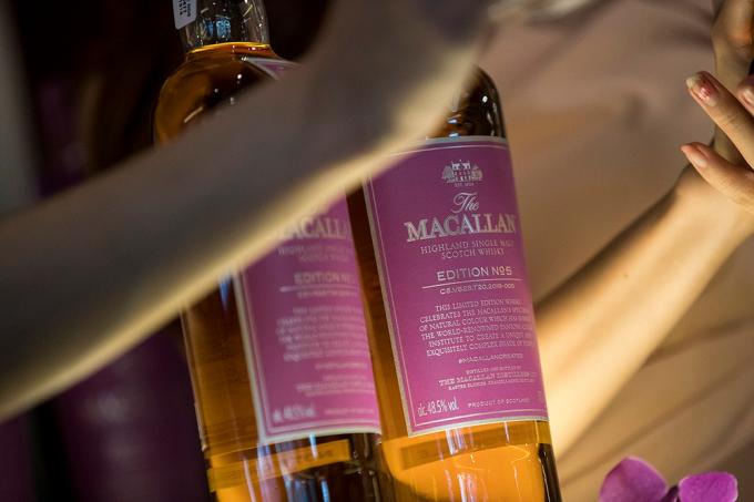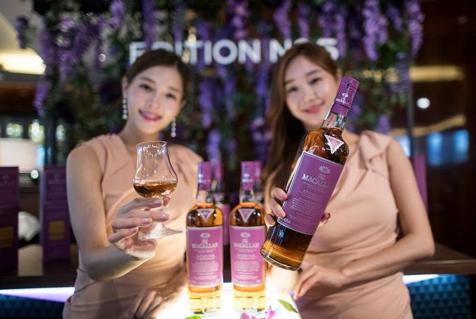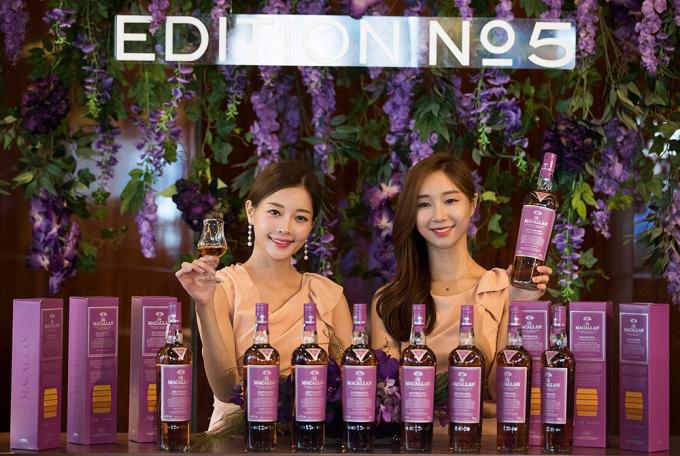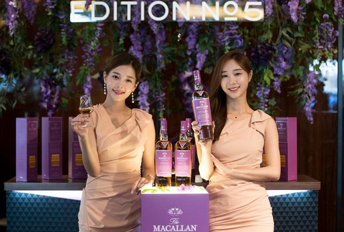 16일 오전 서울 중구 웨스틴조선호텔 서울에서 열린 맥켈란, 한정판 에디션 넘버5 출시 기념 사진행사에서 모델들이 제품을 소개하고 있다.