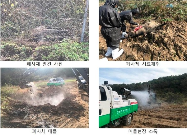 연천군과 파주시는 각각 폐사한 멧돼지에서 시료를 채취한 뒤 표준행동지침(SOP)에 따라 매몰했으며 작업자를 소독하고 주변 방역작업도 실시했다.