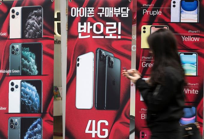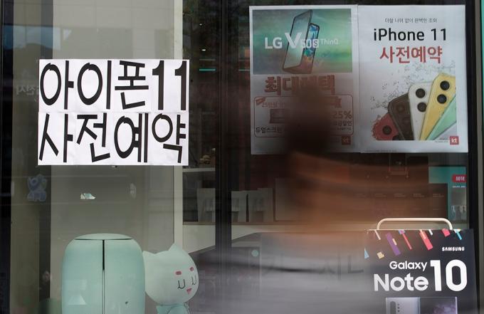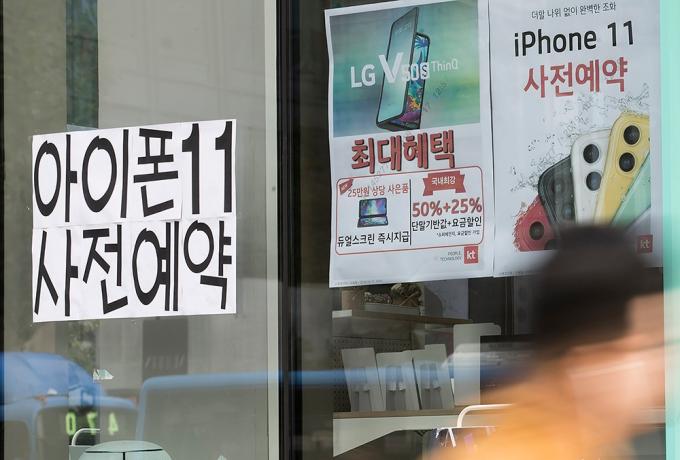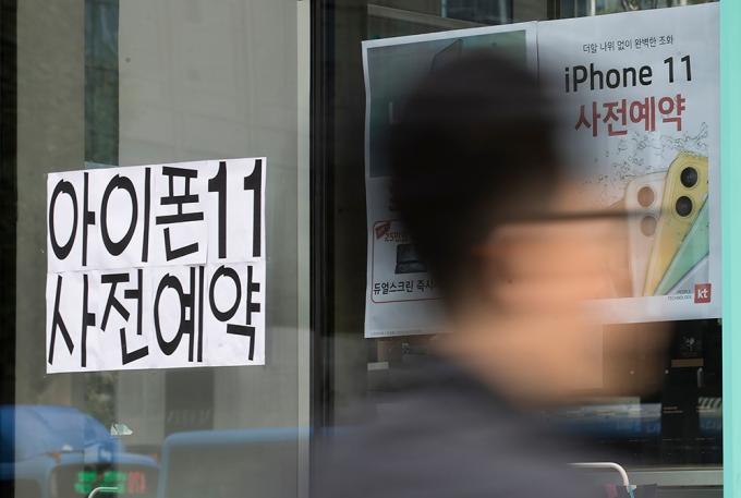 이동통신 3사가 18일 애플의 새로운 스마트폰 아이폰11 시리즈 예약판매를 시작했다. 아이폰11은 64GB기준 99만 원부터 출시된다. 공식출시는 오는 25일. 이날 오전 서울 종로의 한 휴대폰 판매점에 아이폰11 예약판매 안내문이 붙어 있다.