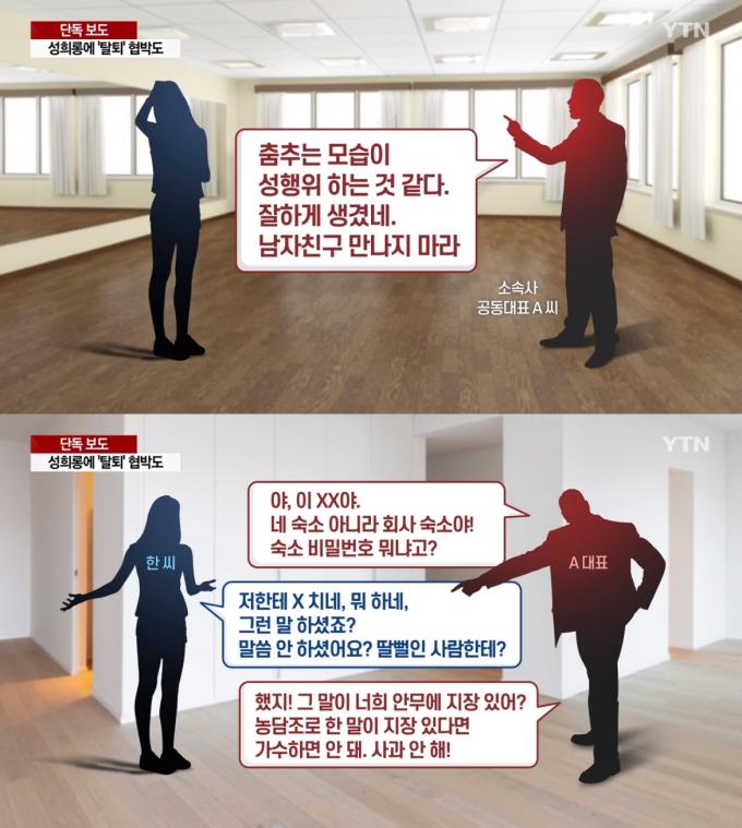 지난 1일 안무 연습을 하던 A 씨는 대표에게 '춤추는 모습이 성행위를 하는 것 같다'는 등의 말을 들었다. 수치심을 느낀 A 씨는 사과를 요구했지만 이를 거부한 대표는 한밤 중에 숙소까지 찾아와 소리치는 등 고압적인 태도로 맞섰다.