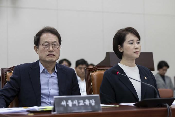 ▲ 수도권 교육감들이 18일 자사고와 외국어고 등을 일반고로 전환해야 한다는 견해를 밝혔다. 사진은 지난달 24일 오후 서울 여의도 국회에서 열린 교육위원회 전체회의에 출석한 유은혜 사회부총리 겸 교육부장관(오른쪽)과 조희연 서울시교육감. [문재원 기자]
