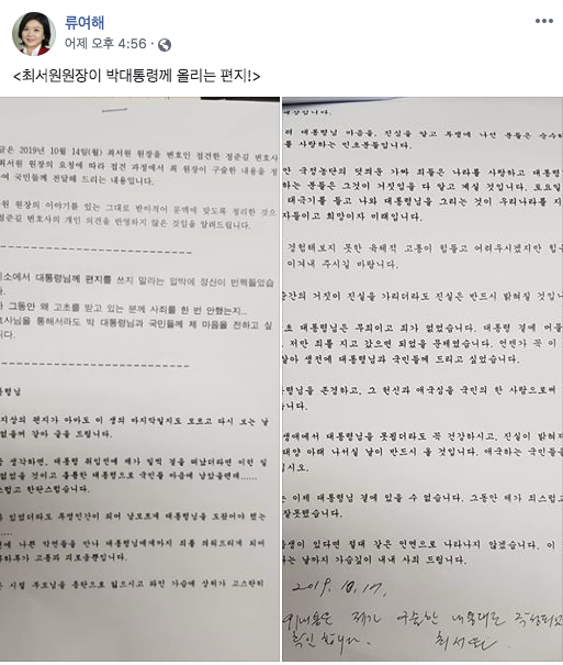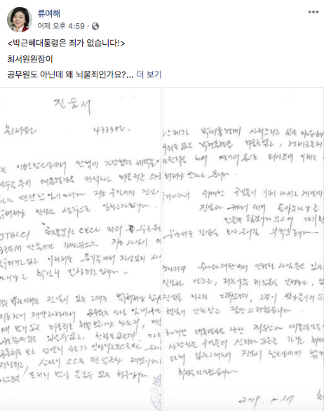 최순실 씨가 박근혜 전 대통령에게 쓴 "대통령님은 무죄…이생이 끝나는 날까지 가슴 깊이 사죄드린다"는 내용의 옥중서신을 류여해 전 자유한국당 최고위원이 공개했다.