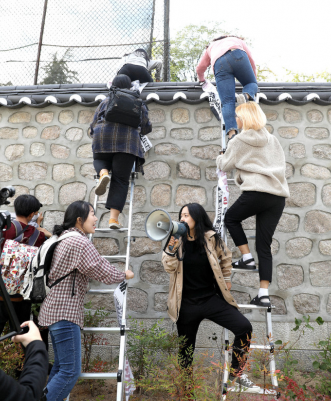 ▲ 한국대학생진보연합이 지난 18일 오후 서울 중구 주한 미국대사관저에서 방위비분담금 협상과 관련해 기습 농성을 하기 위해 담벼락을 넘고 있다. [뉴시스]