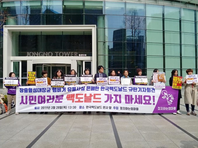 ▲ 시민단체 '정치하는엄마들'은 지난 3월 28일 한국맥도날드 본사 앞에서 '장출혈성대장균 햄버거 유통사실 은폐한 한국맥도날드 규탄 기자회견'을 열었다. [정치하는엄마들 제공]