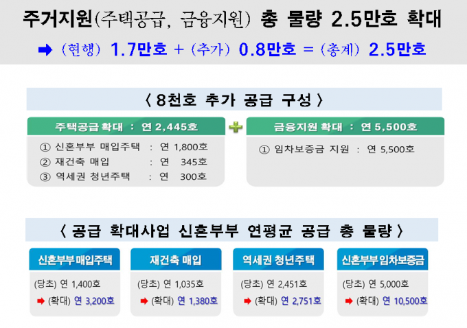 서울연구원은 이번 주거지원 확대로 사회경제적 편익 6조4000억 원, 생산유발효과 7조8000억 원, 부가가치 4조7000억 원, 일자리창출 3만2825개 등의 파급효과가 있을 것으로 기대하고 있다.
