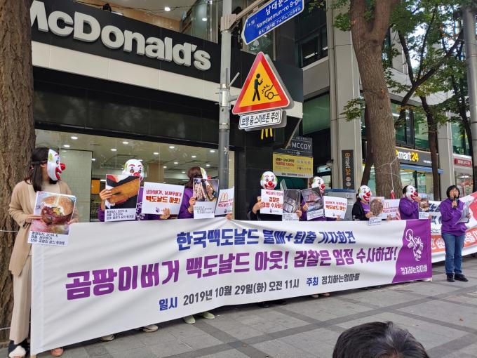 정치하는엄마들은 29일 오전 11시께 서울 중구 맥도날드 서울시청점 앞에서 맥도날드 불매·퇴출 기자회견을 열고 "검찰은 (맥도날드) 언더쿡(기계 오작동으로 햄버거 패티가 덜 익는 현상)에 대해 엄정 수사하라"고 말했다.