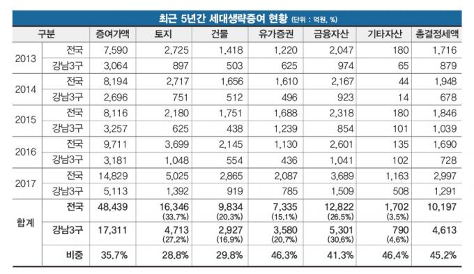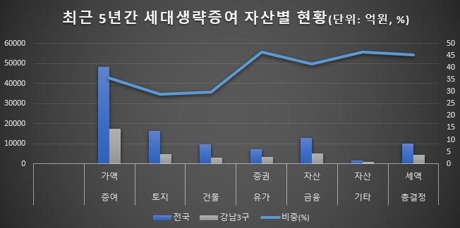 실제로 증여자산 종류별로 전국 대비 강남3구 비중을 보면, △유가증권 46.3% △금융자산 41.3% △건물 29.8% △토지 28.8% 순으로 나타났다.