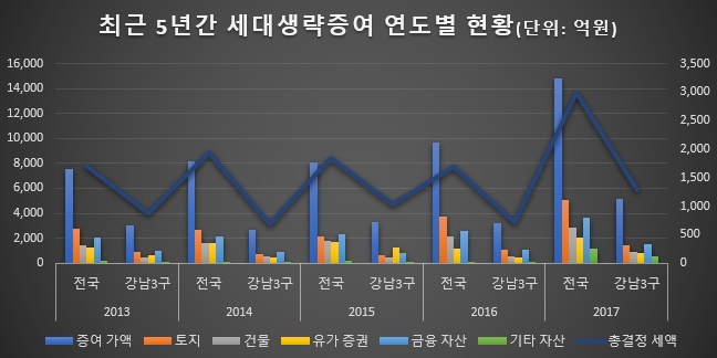 국회 기획재정위원회 더불어민주당 김두관의원이 국세청으로부터 받은 2013년부터 2017년까지 5년간 '세대생략 증여 현황'을 보면, 최근 5년간 자식 대신 손자손녀에게 증여하는 세대생략 증여액이 2배 가까이 늘어났으며, 그중 '강남3구'가 차지하는 비중이 35.7%에 달하는 것으로 나타났다.