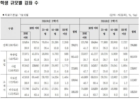 반면 같은 기간 51~100명이 듣는 강의는 3만950개에서 3만1385개로 435개가 늘었고, 101명 이상 강의는 2232개에서 2358개로 126개 늘었다.