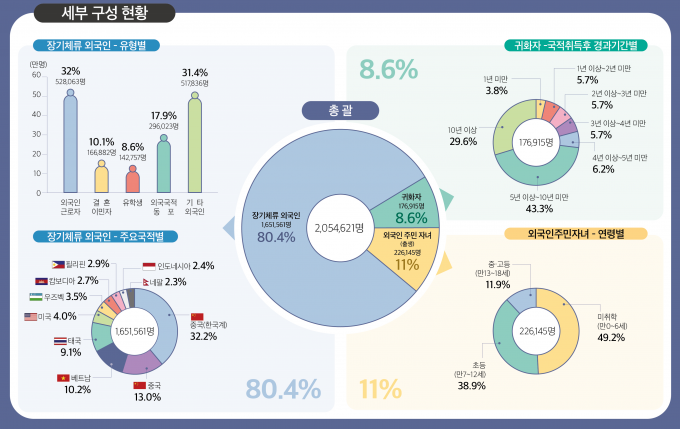 외국인주민은 국내에 거주하는 장기체류 외국인·귀화자·외국인주민 자녀 등을 말한다. 유형별로는 외국인근로자·외국국적동포·결혼이민자 등 장기체류 외국인이 165만1561명으로 80.4%에 달한다. 귀화자는 17만6915명(8.6%), 외국인주민 자녀(출생)는 22만6145명(11.0%)으로 뒤를 이었다.