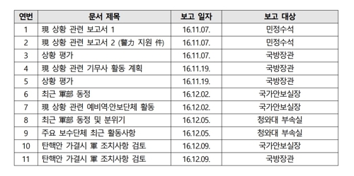 군인권센터는 이날 보도자료를 통해 "최근 제보를 통해 2016년 말 국군기무사령부(이하 기무사) 정보융합실에서 청와대 국가안보실장, 민정수석, 청와대 부속실과 국방부 장관 보고용으로 작성한 상황 보고 문서 목록을 입수했다"며 목록을 공개했다.