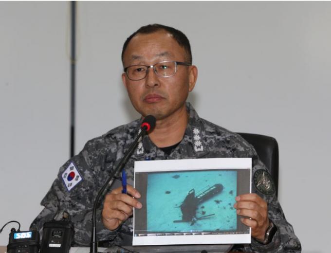 ▲ 제병렬 해군특수전단 참모장(대령)이 4일 오후 강원 동해시 동해지방해양경찰청 3층 대회의실 브리핑실에서 독도 해상에 수심 78m에 가라앉은 동체와 블랙박스, 보이스레코더 장치 수색 계획에 대해서 설명을 하고 있다. [뉴시스]
