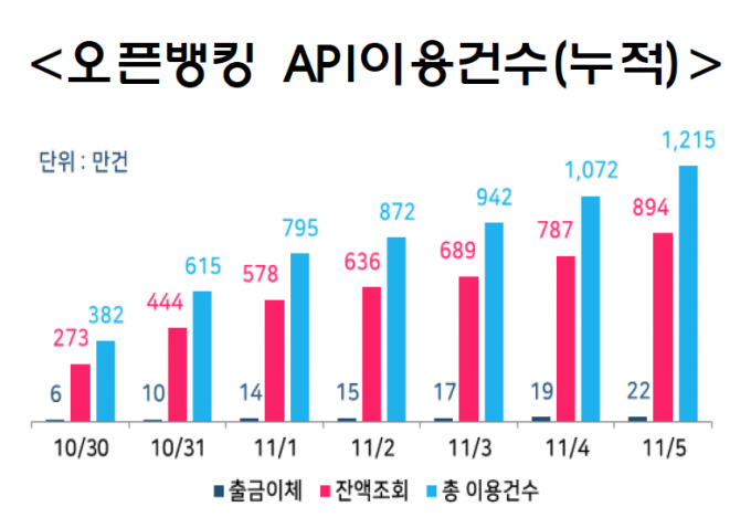 오픈뱅킹 서비스의 총 이용 건수는 1215만 건(일평균 174만 건)이었다. 출금이체 22만 건, 잔액 조회 894만 건, 기타 API(오픈 응용프로그램 인터페이스) 이용 299만 건 등이다.