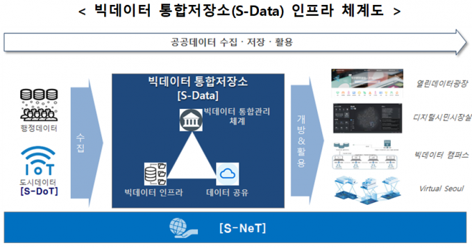 행정뿐 아니라 기업과 시민도 활용할 수 있도록 열린데이터광장, 빅데이터캠퍼스, 디지털시민시장실 등을 통해 개방된다. '빅데이터 통합저장소'는 스마트 서울 네트워크(S-Net), 도시데이터 센서(S-Dot)와 함께 스마트시티 서울을 이끌어갈 주요 3대 인프라 축으로 추진된다.