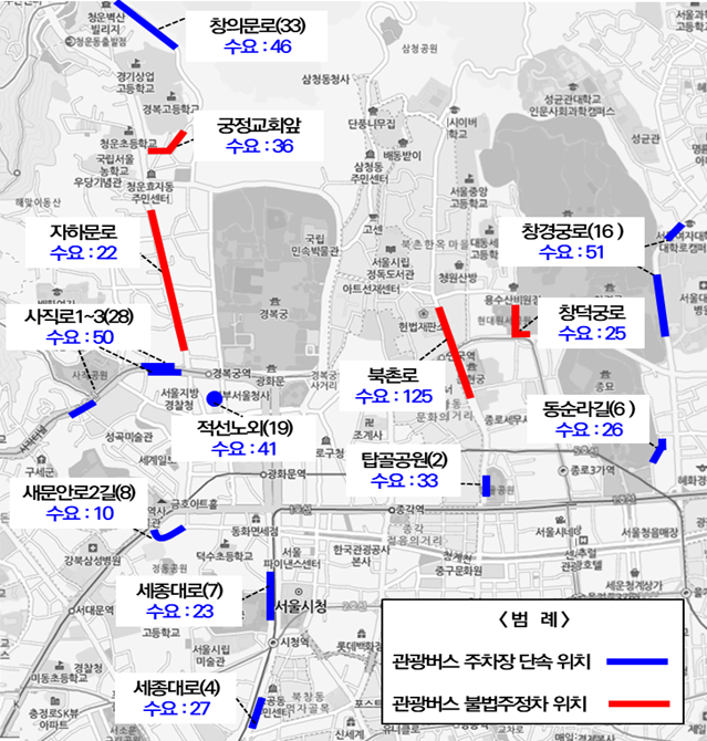 서울시는 "관광성수기를 맞아 대형 백화점, 고궁, 면세점, 인사동 주변에 관광버스가 일렬로 불법 주정차를 일삼아 교통체증이 극심하고 시민들의 불편이 크다"면서 "인근 상가주민, 보행자, 운전자 등으로부터 단속 요청 민원이 지속적으로 들어오고 있다"고 설명했다.