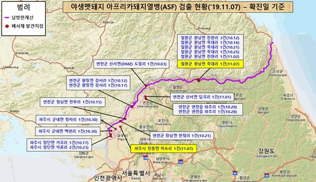 이로써 멧돼지 폐사체에서 ASF 바이러스가 검출된 사례는 전국적으로 22건이 됐다. 연천 8건, 철원에서 8건, 파주에선 6건이다.
