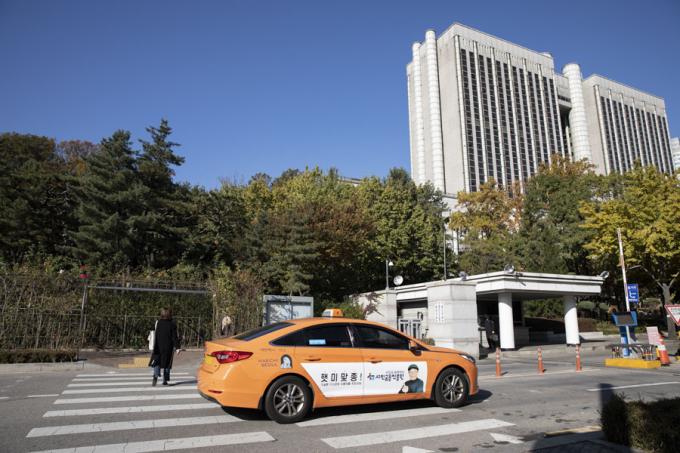 ▲서울중앙지법 앞 신호등이 없는 횡단보도에 보행자가 채 건너가기 전에 택시가 지나고 있다. 미국에서는 보행자가 완전히 보행로를 벗어나지 않은 상태에서 차량이 지나치면 처벌을 받는다. [문재원 기자]