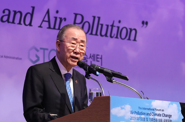 ▲ 반기문 국가기후환경회의 위원장이 지난 4일 오전 서울 중구 롯데호텔에서 열린 2019 대기오염 및 기후변화 대응 국제포럼에 참석해 개회사를 하고 있다. [뉴시스]