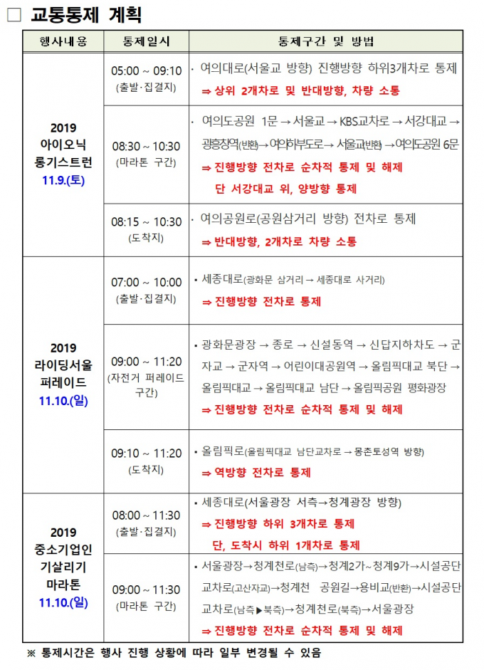 같은 시간 중구 일대에서는 중소기업진흥회가 주최하는 '2019 중소기업인 기 살리기 마라톤'이 진행된다. 이때 세종대로, 종로, 천호대로, 능동로, 광나루로, 올림픽대교, 올림픽로, 청계천로 일대의 교통이 통제된다.