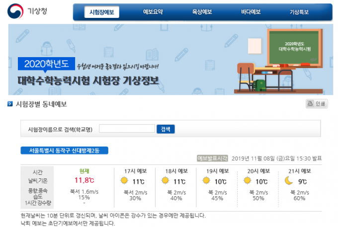 ▲ 기상청 날씨누리 홈페이지에서 수능 시험장별 날씨 예보를 찾아볼 수 있다. [기상청 홈페이지 캡처]