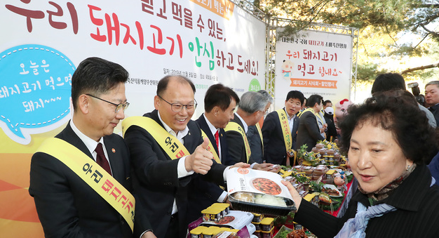 김 장관은 이 자리에서 "아프리카돼지열병(ASF)으로 돼지고기 소비가 부진해 가격이 하락하면서 농가들이 어려움을 겪고 있다" "ASF는 인체에 무해하고 시중에 판매되는 돼지고기는 철저한 검사를 거쳐 안전하다"고 말했다.