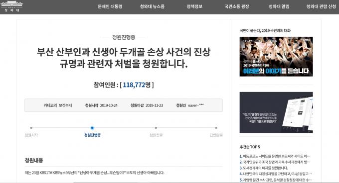 이 청원은 이날 오전 11시 현재 11만8000여 명의 동의를 받았다. 청원 마감일은 오는 23일이다.