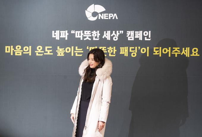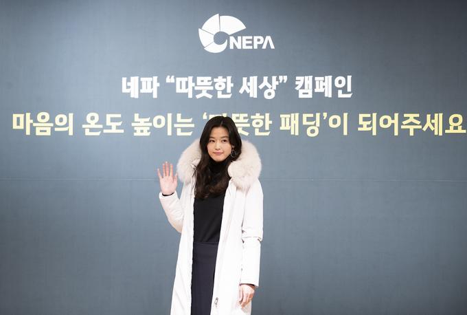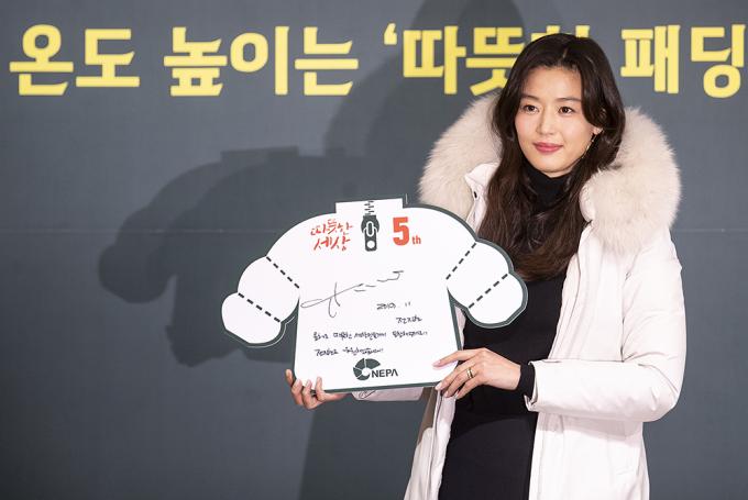 배우 전지현이 12일 오전 서울 중구 웨스틴조선호텔 오키드룸에서 열린 네파 따뜻한 세상 캠페인 '따뜻한 패딩' 전달식에서 포즈를 취하고 있다.