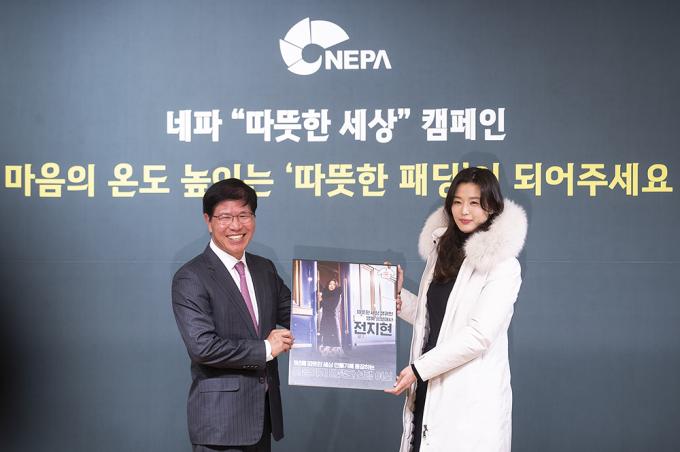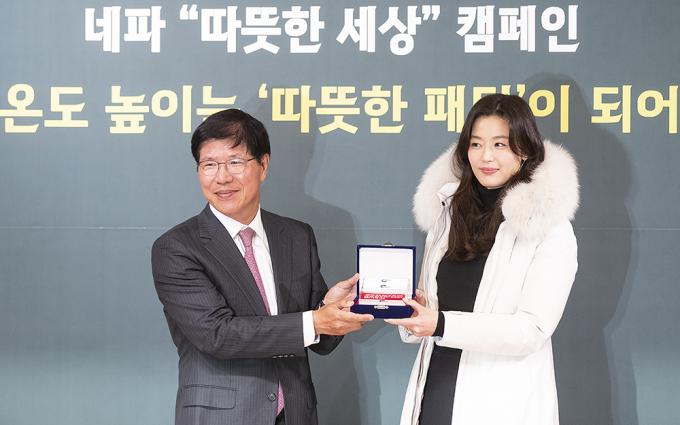 이선효 네파 대표이사가 12일 오전 서울 중구 웨스틴조선호텔 오키드룸에서 열린 네파 따뜻한 세상 캠페인 '따뜻한 패딩' 전달식에서 배우 전지현에게 감사패를 전달하고 있다.