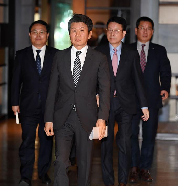 정몽규 HDC현대산업개발 회장이 12일 오후 아시아나 항공 인수 우선협상대상자 선정과 관련 입장을 발표하기 위해 서울 용산구 HDC현대산업개발 본사 대회의실에 마련된 기자회견장으로 향하고 있다. 왼쪽부터 유병규 HDC현대산업개발 부사장, 정 회장, 김대철·권순호 현대산업개발 대표이사.