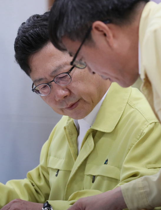 ▲ 김현수 농림축산식품부 장관이 지난 10월 1일 오전 정부세종청서에서 열린 제18호 태풍 '미탁' 대비 및 아프리카돼지열병(ASF) 방역상황 점검 영상회의에서 방역상황을 점검하고 있다. [뉴시스]