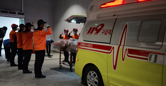 이날 낮 12시 9분께 해경 1513함에서 수습된 시신은 헬기로 대구 공항에 도착한 후 119구급차를 통해 병원에 이송됐다.