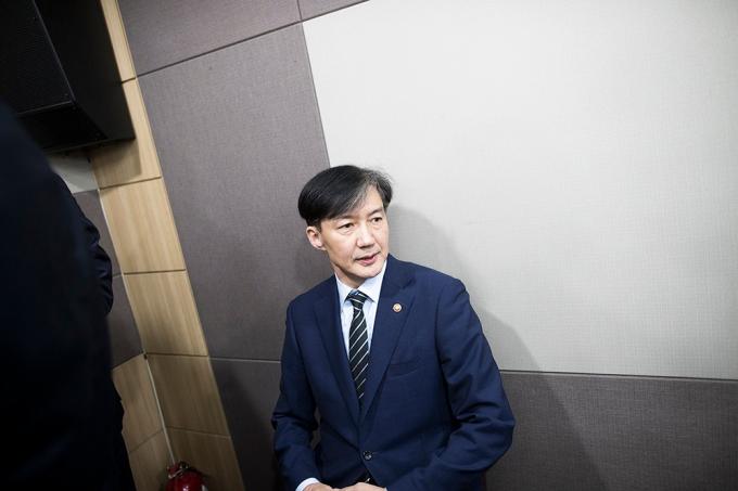 ▲ 조국 전 법무부 장관이 지난달 8일 오후 경기 과천시 정부과천정사 법무부 브리핑실에서 검찰 개혁방안 발표를 마친 뒤 질의응답 전 자리정돈을 위해 의자에 앉아 있다. [정병혁 기자]